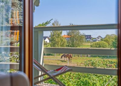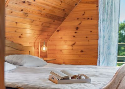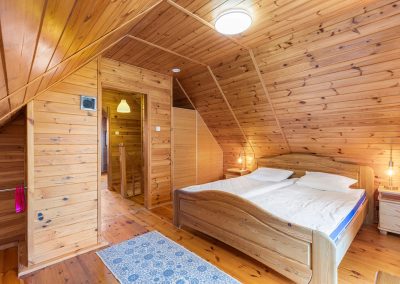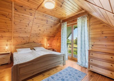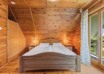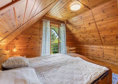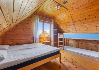 Na piętrze są dwie sypialnie. W sypialni od wschodniej strony jest duże małżeńskie łoże. Po przeciwnej stronie, w drugiej sypialni jest duże łoże oraz piętrowe łóżko. Przed domem jest miejsce parkingowe na jeden samochód. Na wyposażeniu domu jest hamak wolnostojący, trzy leżaki oraz wiatrochron. Weranda wyposażona jest w stolik i krzesła.