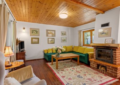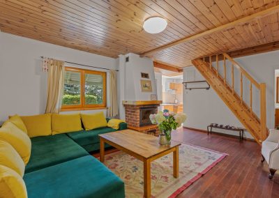 Na parterze znajduje się przytulny salon z kominkiem i rozkładaną narożną sofą.